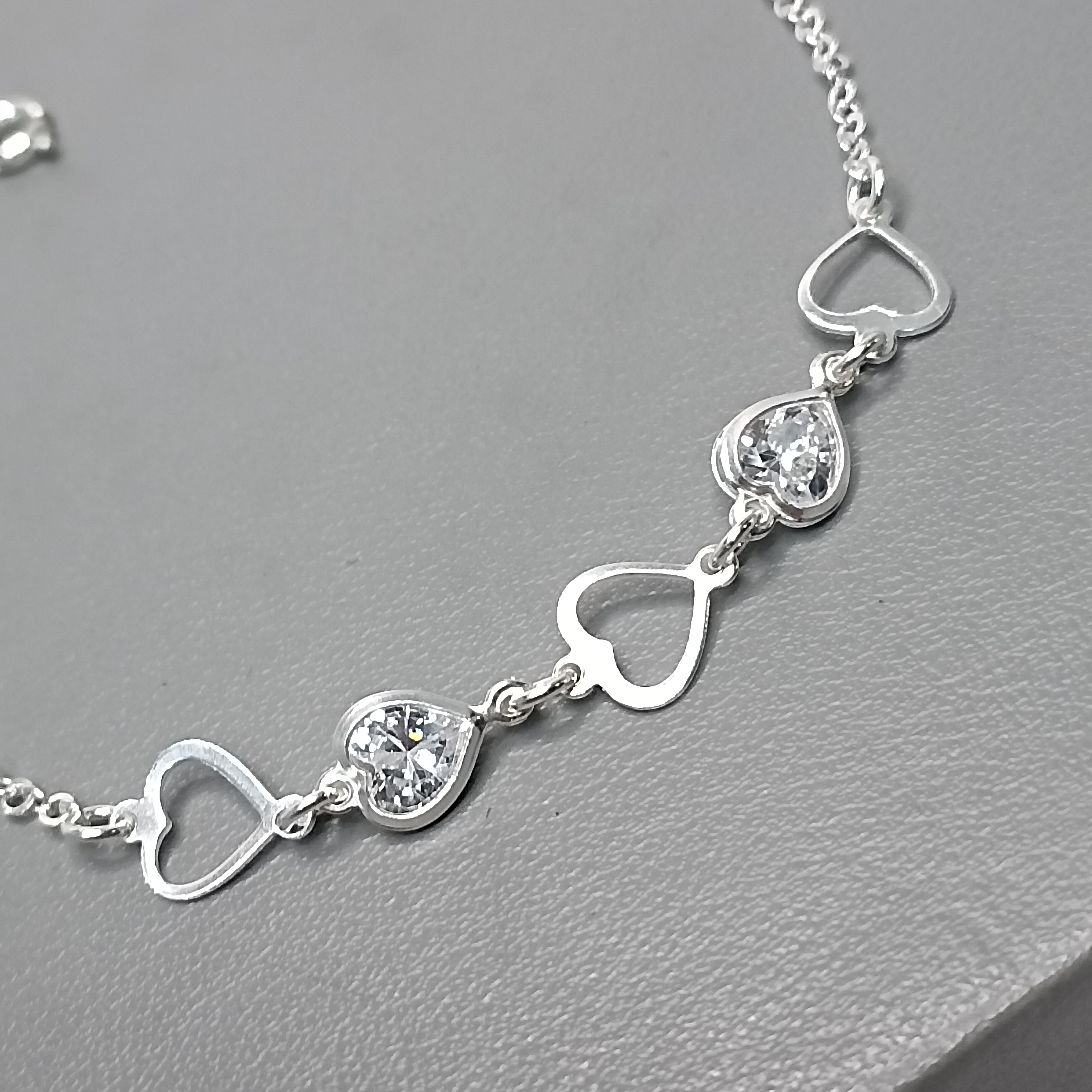 Pulseira De Prata 2 Zirconias Coração 3 Corações Vazados Intercalado Meio Cod:PU-54