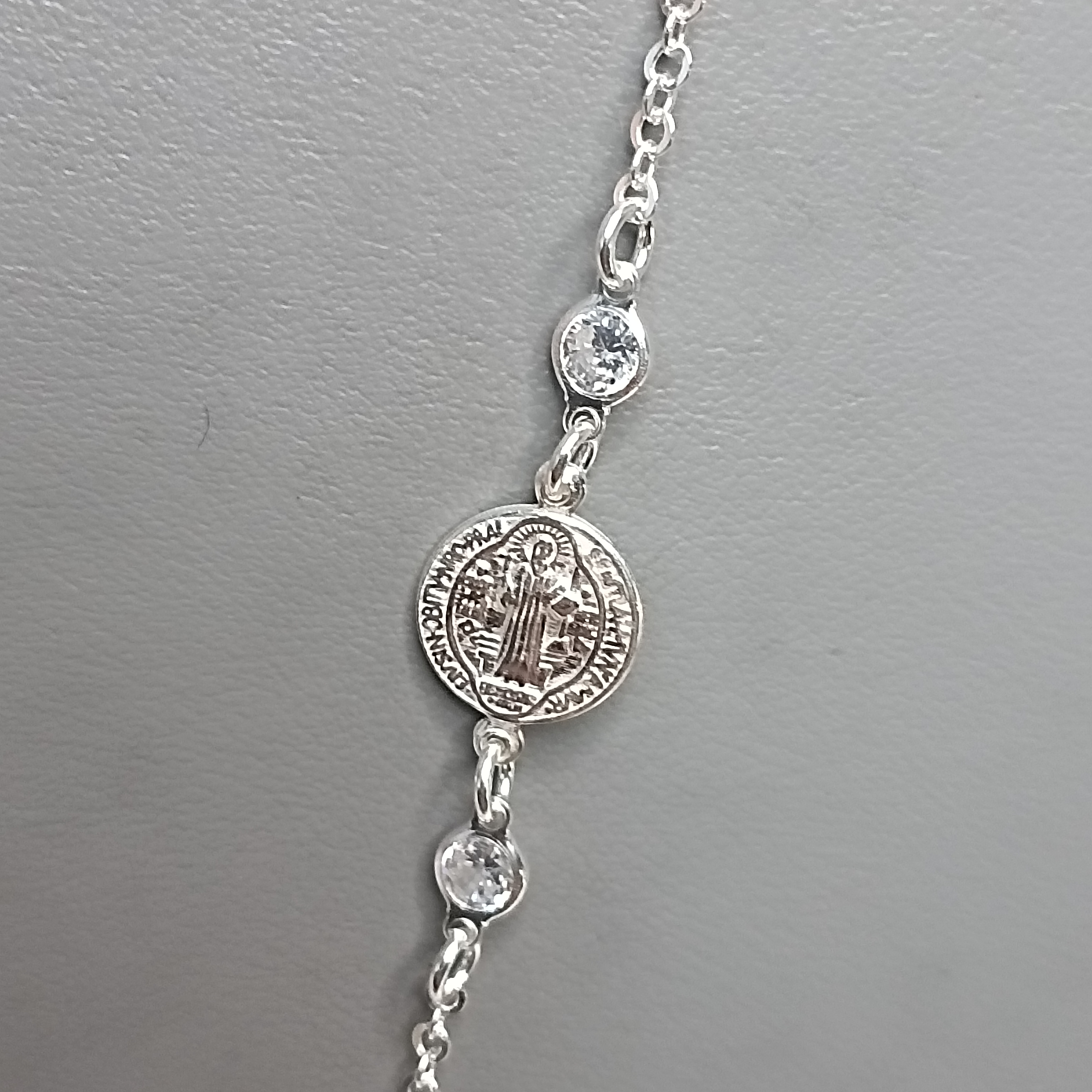 Pulseira De Prata 2 Zirconias Medalha São Bento Meio Cod:PU-64