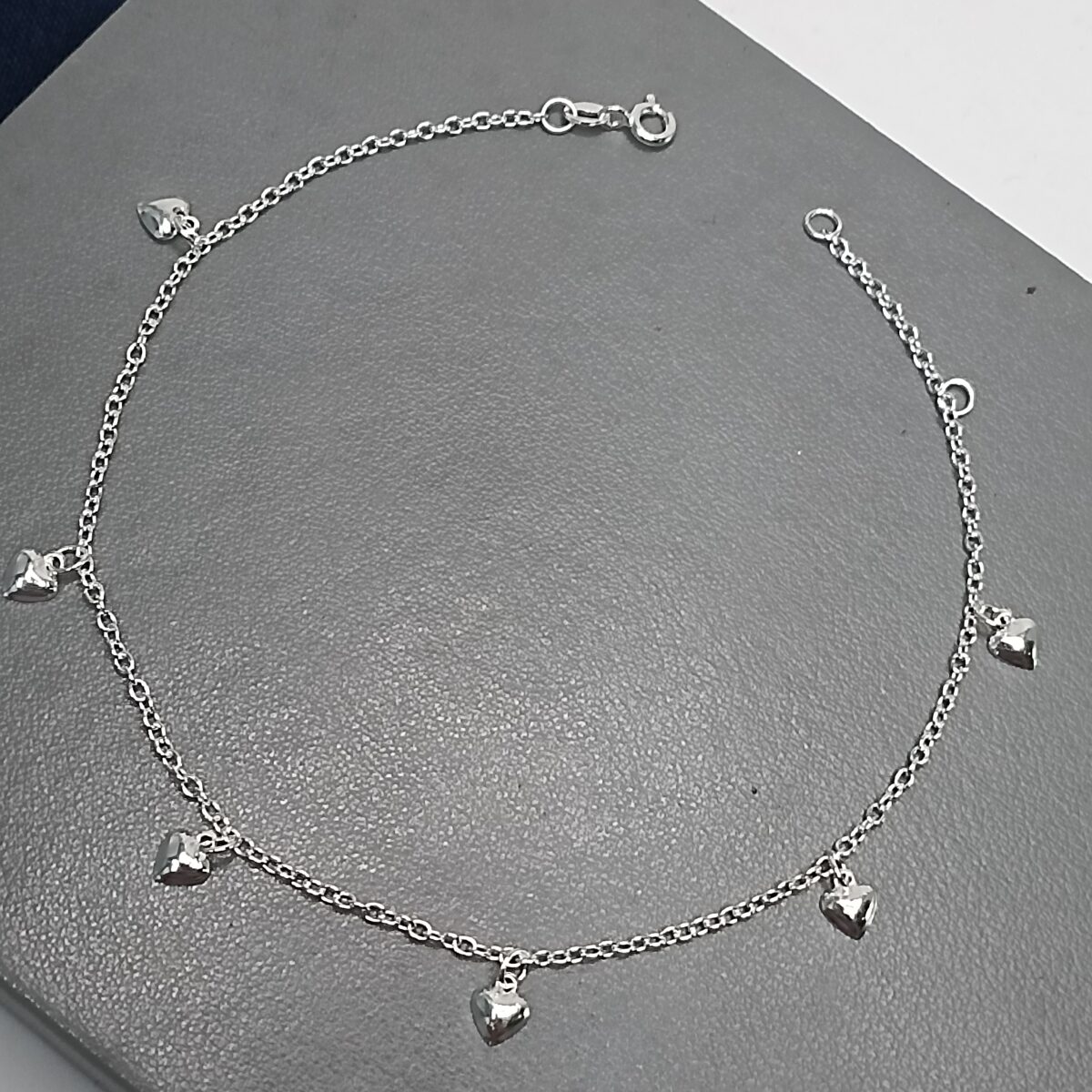 Tornozeleira De Prata 6 Corações Chapa Abaulada Pendente Fio